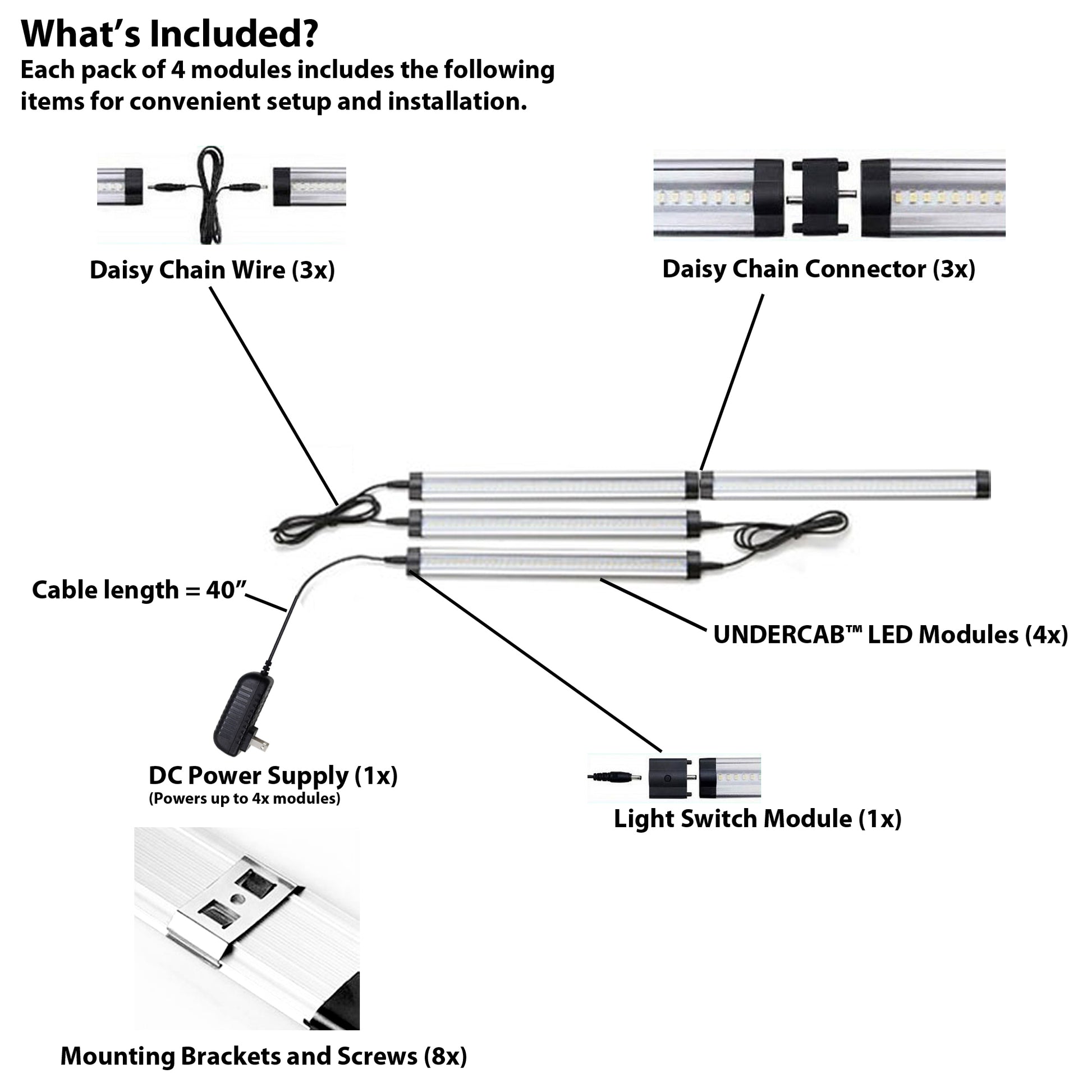 Mounting screws and brackets are included for quick and simple installation. No adhesives or solder to deal with - simply plug the modules into a standard power outlet using the included power supply and you'll be up and running in a matter of minutes.